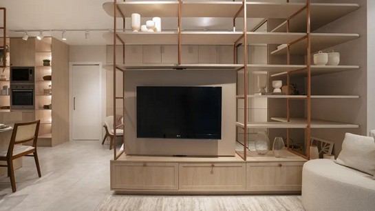 A integração entre espaços também se consolida, mas com maior refinamento projetual. A transição entre sala e cozinha planejada, por exemplo, não se limita à ausência de paredes. Ela é construída por meio de continuidade de acabamentos, alinhamento de volumes e soluções sob medida que organizam sem fragmentar. Um painel pode estruturar a circulação, incorporar armazenamento oculto e ainda criar unidade estética entre áreas distintas.